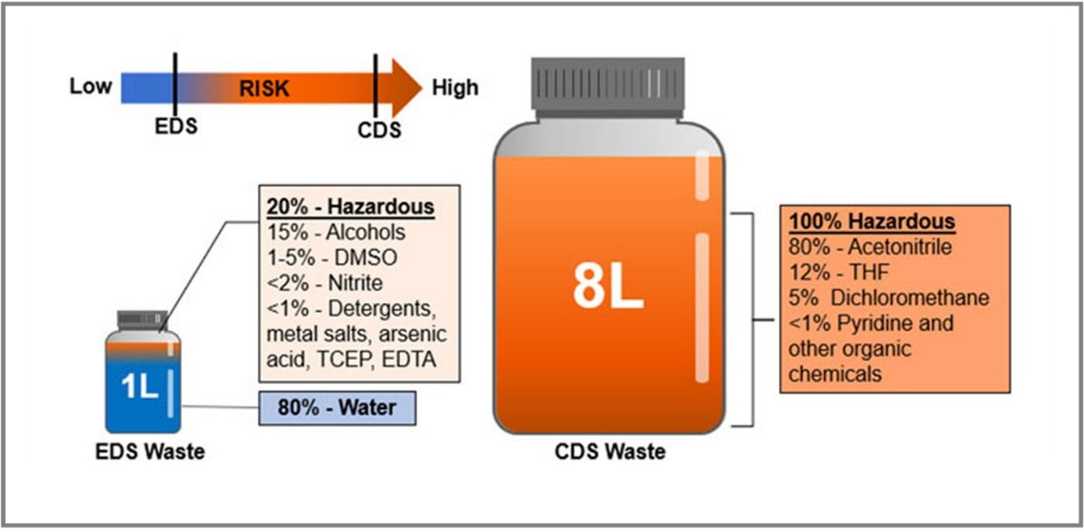 Modern labs prioritizing sustainability find themselves in a bind as well. The acetonitrile and other harsh solvents required for chemical synthesis generate hazardous waste that’s expensive to dispose of and contradicts green initiatives.